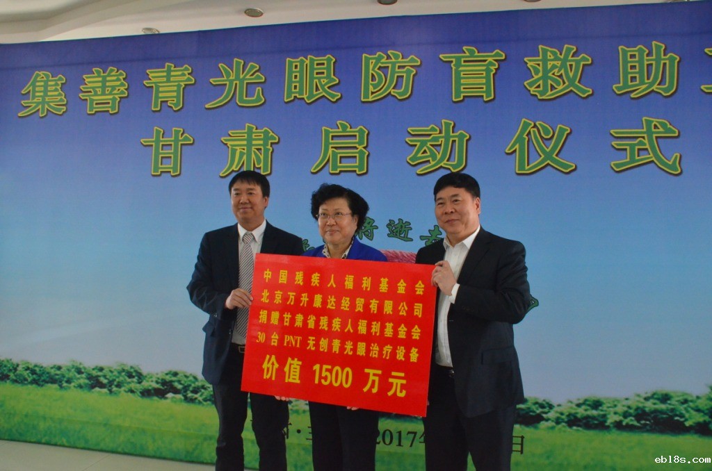在第二十七个全国助残日来临之际,为帮助我省贫困青光眼和高眼压症患者解除病痛、恢复视力、降低致盲率,推动防盲治盲工作,中国残疾人福利基金会、北京万升康达经贸有限公司在我省实施集善青光眼防盲救助工程,捐赠价值1500万元的30台美国PNT无创青光眼治疗设备。5月12日上午在兰州举行救助工程甘肃启动仪式。中国残联副理事长贾勇、省政协副主席李沛文、民建中央办公厅副主任李建国、中国残疾人福利基金会副秘书长沈伟俊、北京万升康达有限公司董事长杨外生,省政府副秘书长郭春旺,省残联党组书记、理事长华文哲,省残疾人福利基金会理事长朱雪明、副理事长高世成、杨清友和省卫计委业务负责人出席了仪式。受赠残联及医院负责人、医务人员,共100多人参加了启动仪式。